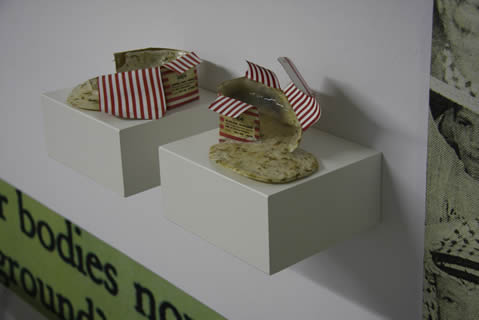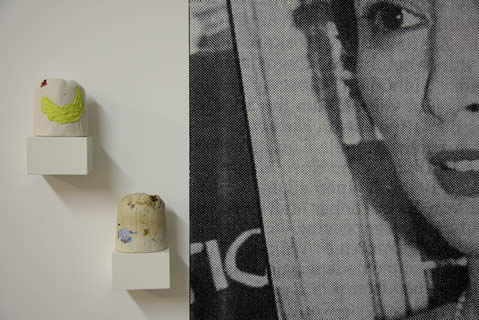 Digital prints adhered to the wall; sculptural objects on shelves